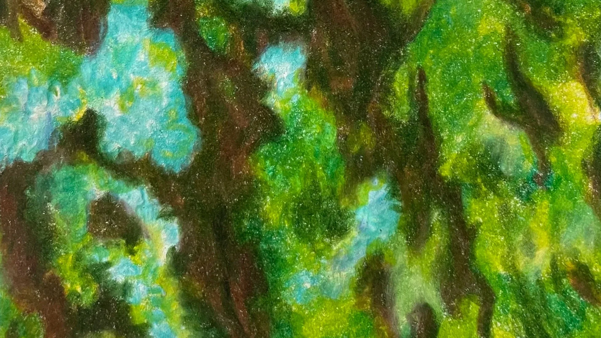 Close-up of my most recent piece, Magic Forest, 2026. Colored pencil on paper.